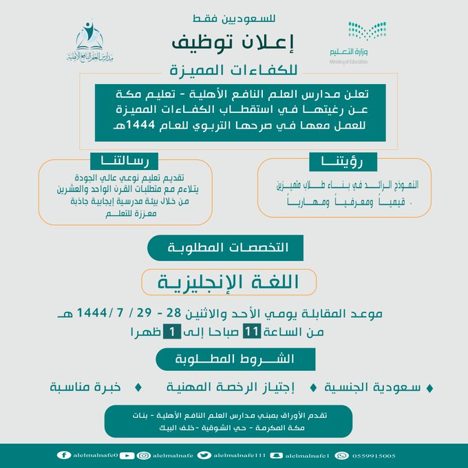 مدارس العلم النافع الأهلية توفر وظائف تعليمية لحملة البكالوريوس للعمل في مكة