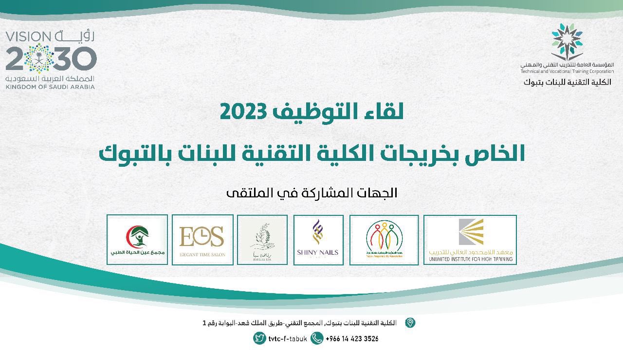 تعلن (الكلية التقنية للبنات بتبوك) عبر حسابها الرسمي (تويتر) عن إقامة لقاء توظيفي للخريجات بمشاركة عدد من جهات العمل مثل (مجمع عين الحياة الطبي، معهد اللامحدود العالي للتدريب، شركة EOS)، وذلك وفقاً للتفاصيل والشروط الآتية.