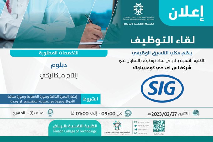 الكلية التقنية للبنين بالرياض توفر فرص وظيفية للعمل في شركة SIG لحملة الدبلوم