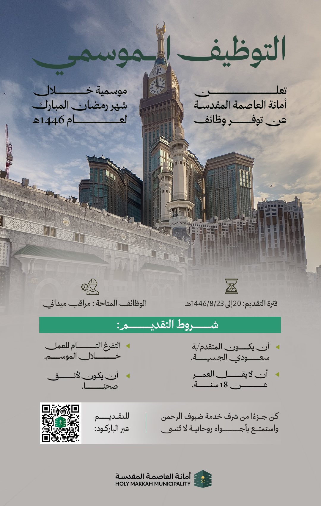 تعلن أمانة العاصمة المقدسة عن توفر وظائف موسمية بمسمى (مراقب ميداني) وذلك خلال شهر رمضان المبارك لعام 1446 هـ.